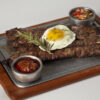Entraña papas fritas, huevo frito, chimi y salsa criolla