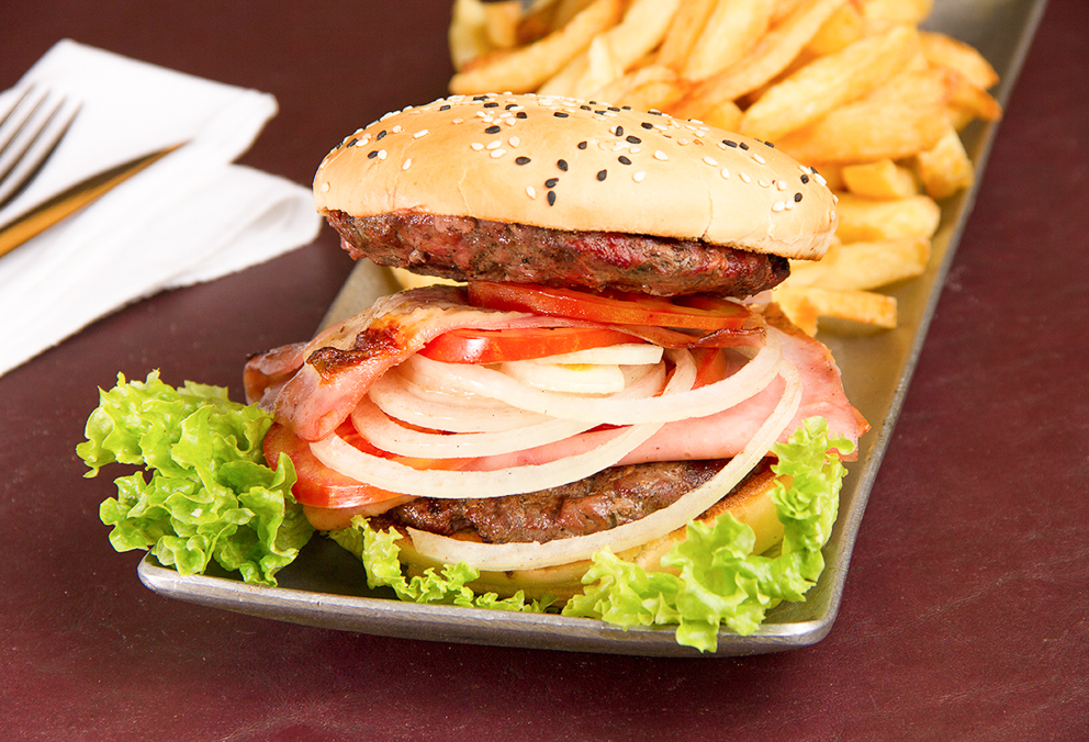 Doble carne, doble jamon , muzzarella , cebolla y tomate