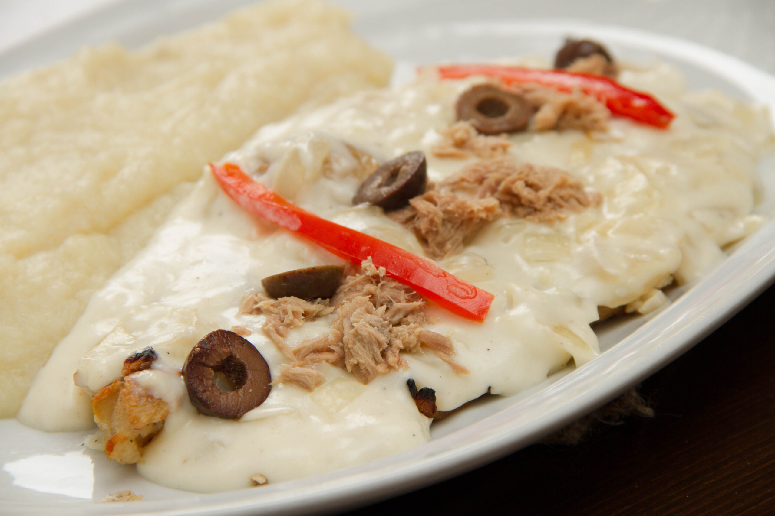 atún, salsa blanca, crema, cebolla con puré de papas