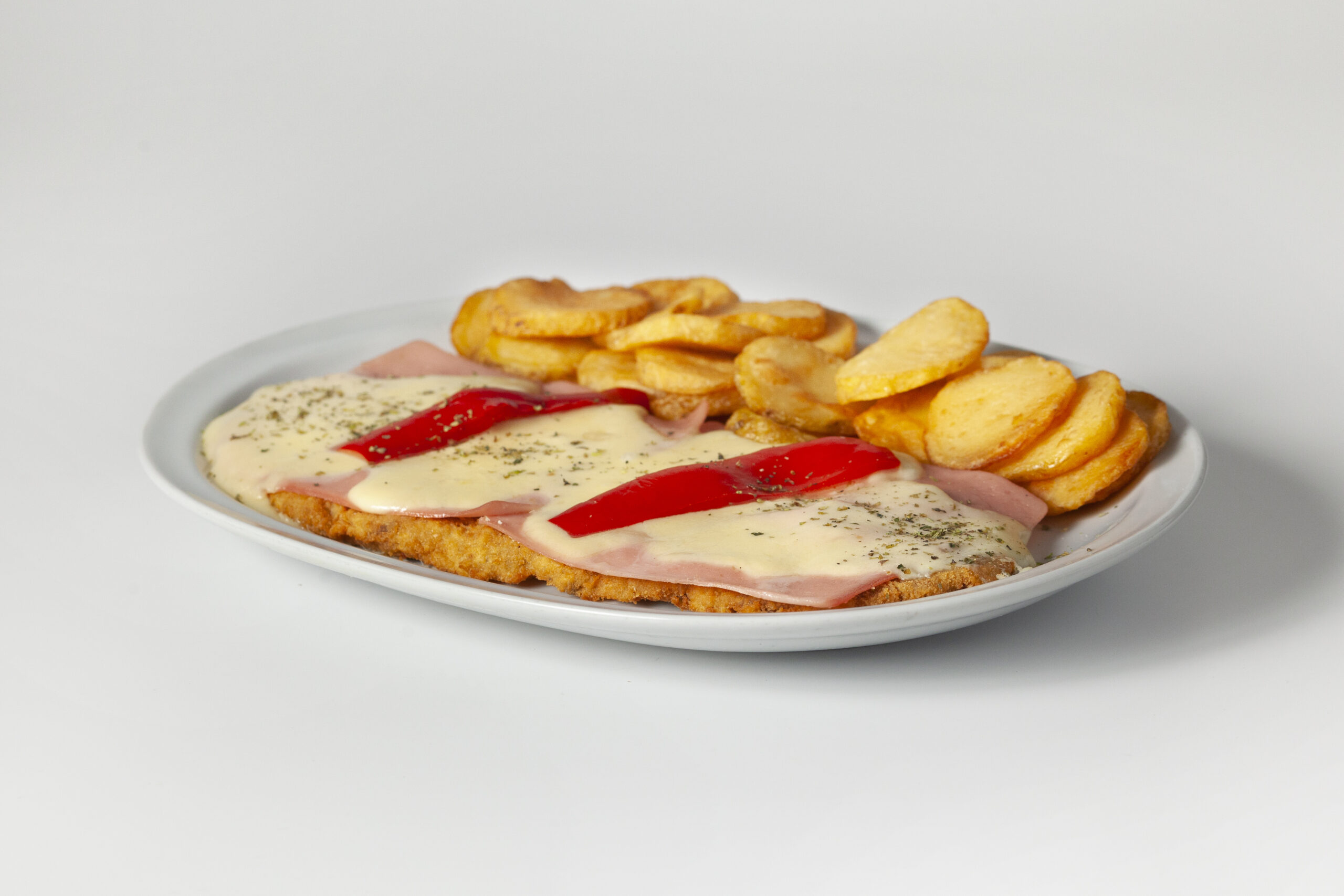 Muzzarella, jamon y morrones con papas españolas