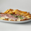 Jamon, morrón, banana frita,crema de choclo con papas paille